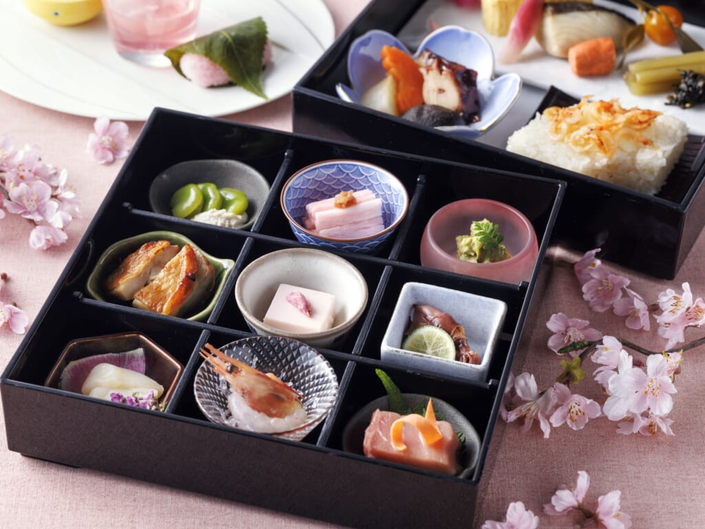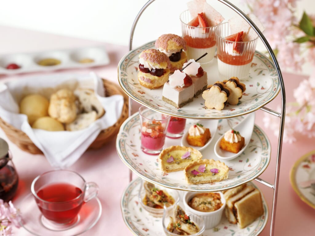 同フロアにあるスカイレストラン「丹頂」では、『季節の二段重~さくら~』を用意。旬を迎える桜鯛や筍など、季節の旨味をお重に詰め込んだお弁当スタイルのランチを楽しめます。「The Lobby Lounge」では、アーモンド風味豊かなしっとりとした焼き菓子・パンドジェーヌに、桜風味のクリームや苺、白桃のムースを重ね、春の華やぎを表現したスイーツ『プリマヴェーラ』や、3段ティートレイに桜をテーマにしたスイーツやセイボリーを並べた『さくらアフタヌーンティーセット』を用意しています。
