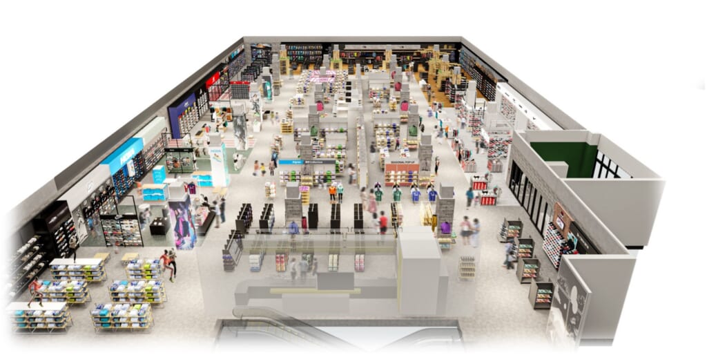 ランニングコーナーを始めとした各所に大型LEDビジョンを設置し、ダイナミックな映像演出と売場演出によって、単なる売場、単なる体験にとどまらず、まるでスタジアムやフィールドにいるような没入感とともに、商品を選ぶプロセスそのものを楽しめる新たな感動拠点を目指します。