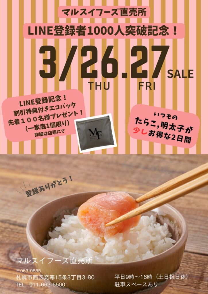 たらこ・明太子製造会社 マルスイフーズ株式会社は、LINE登録者1,000人突破を記念し、2026年3月26日(木)、27日(金)にイベントを開催します。