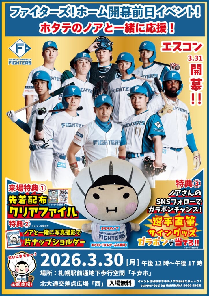 株式会社マルナカ相互商事は、北海道日本ハムファイターズのエスコンフィールド本拠地開幕戦の前日2026年3月30日(月)に、『ホタテのノア』と一緒にファイターズを応援しよう!イベントを開催します。場所は、チ・カ・ホ 札幌駅前通地下広場 北大通交差点広場(西)。3月31日(火)のエスコンホーム開幕戦に向けて一緒にファイターズを盛り上げます。