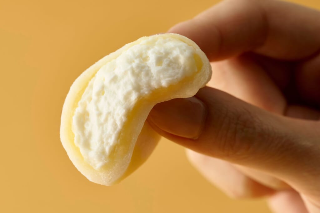 北海道産のもち米を使用したやわ餅に、北海道産のクリームチーズを贅沢に練り込みました。つきたてのお餅にメレンゲを加えることで、やわやわでもっちりとした食感と、とろけるような口どけを実現しています。
