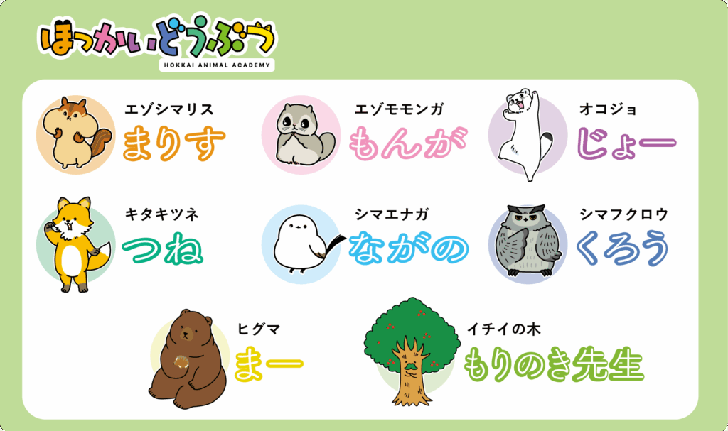 『ほっかいどうぶつ』とは、北海道の森にある小さな学び舎「ほっかいどうぶつ学園」を舞台に、個性豊かな動物たちがのんびり・にぎやかな毎日を過ごす物語です。