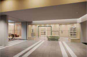 店内は端材の石や木、モルタル、カーペットといった異なる素材を組み合わせ、「質感のミックス」を空間の軸に据えた内装です。均質に整えるのではなく、素材が本来持つ差異や揺らぎをそのまま生かすことで、日常の中にささやかな非日常を感じながらショッピングを楽しめます。異なる要素が混ざり合い、ミックスそのものをスタンダードとする、MAISON SPECIALらしい価値観を体現した空間を体感できます。