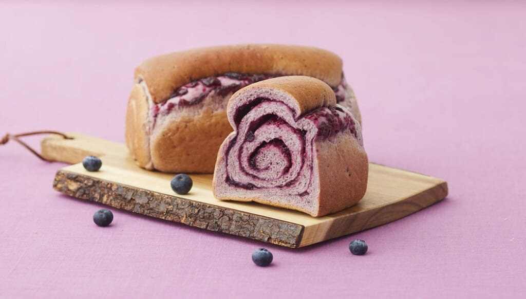 「ブルーベリーブレッド」生地にもブルーベリーソースが練りこまれており、中身の渦を巻いているブルーベリージャムはなんと130g。1日1200本を販売するほどの人気商品です。