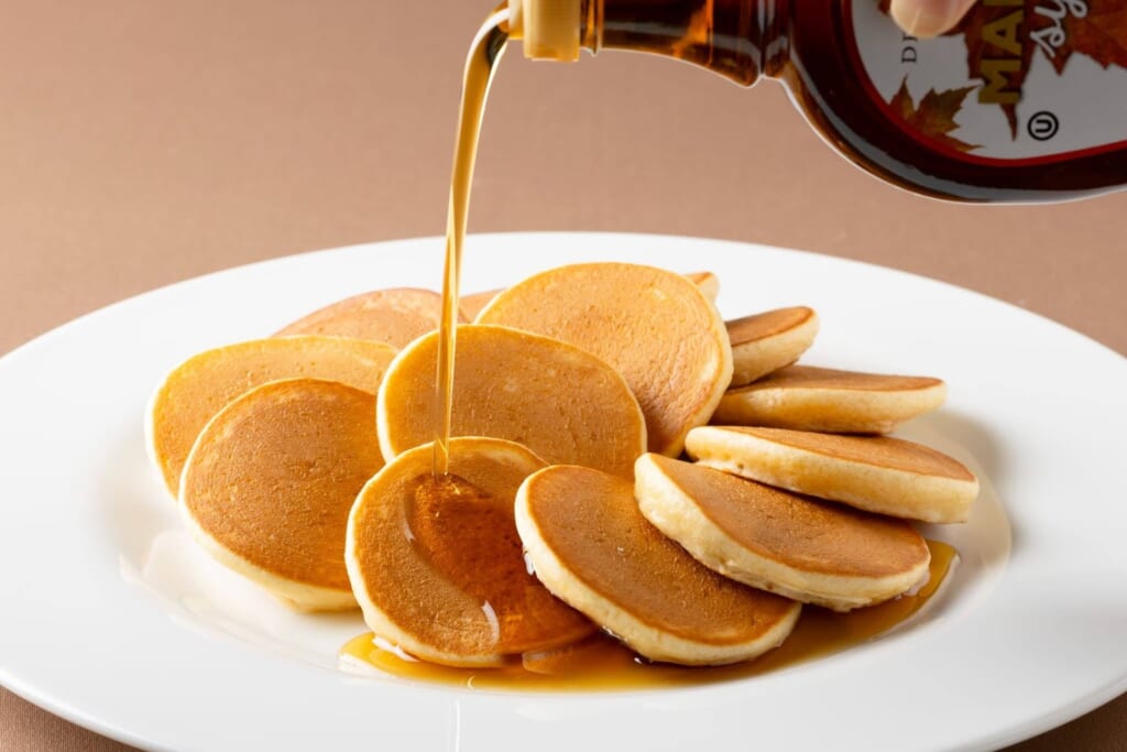 実演メニューとして、ふわふわに焼き上げる「ミニパンケーキ」は、自家製アイス2種を選べる人気の一品です。
