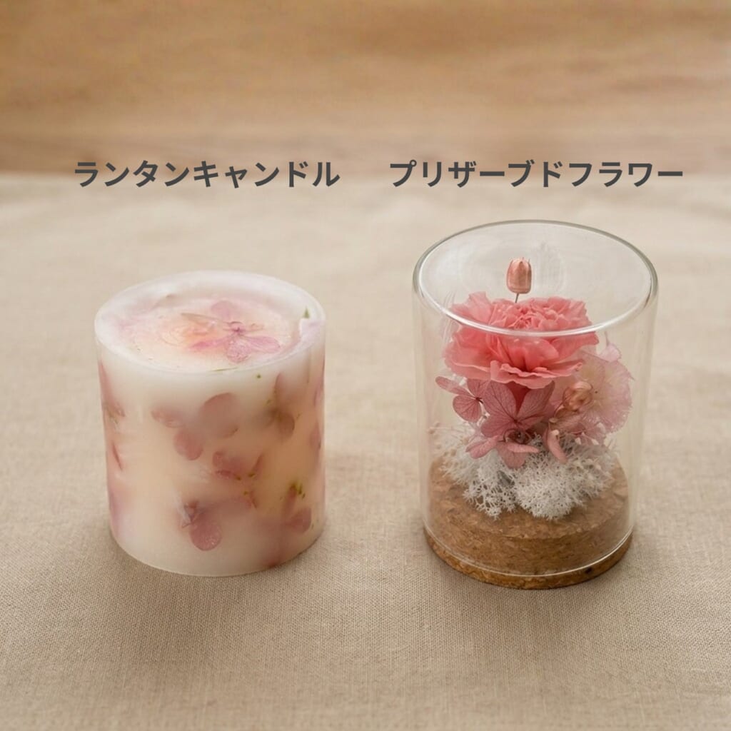 花農家に生まれ、花屋での勤務やアレンジメント講師としての経験を持つ作家が制作。ランタンキャンドルまたはプリザーブドフラワーから選べます。
