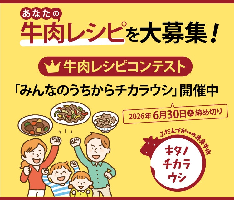 キタノチカラウシの誕生にあわせて、この牛肉を使ったレシピコンテストを開催します。テーマは、牛肉の“ふだんづかい”。いつもの食卓で楽しんでいる工夫や、家族に人気の一品など、生活クラブの組合員自身の定番レシピを募集します。応募されたレシピは、各地の生活クラブ組合員が投票し、最優秀レシピ3つを選出します。また生産者・北海道チクレンによるチクレン賞も選出し、合計4名には生活クラブのギフトで大人気の「牛肉バラエティセット」をプレゼントします。