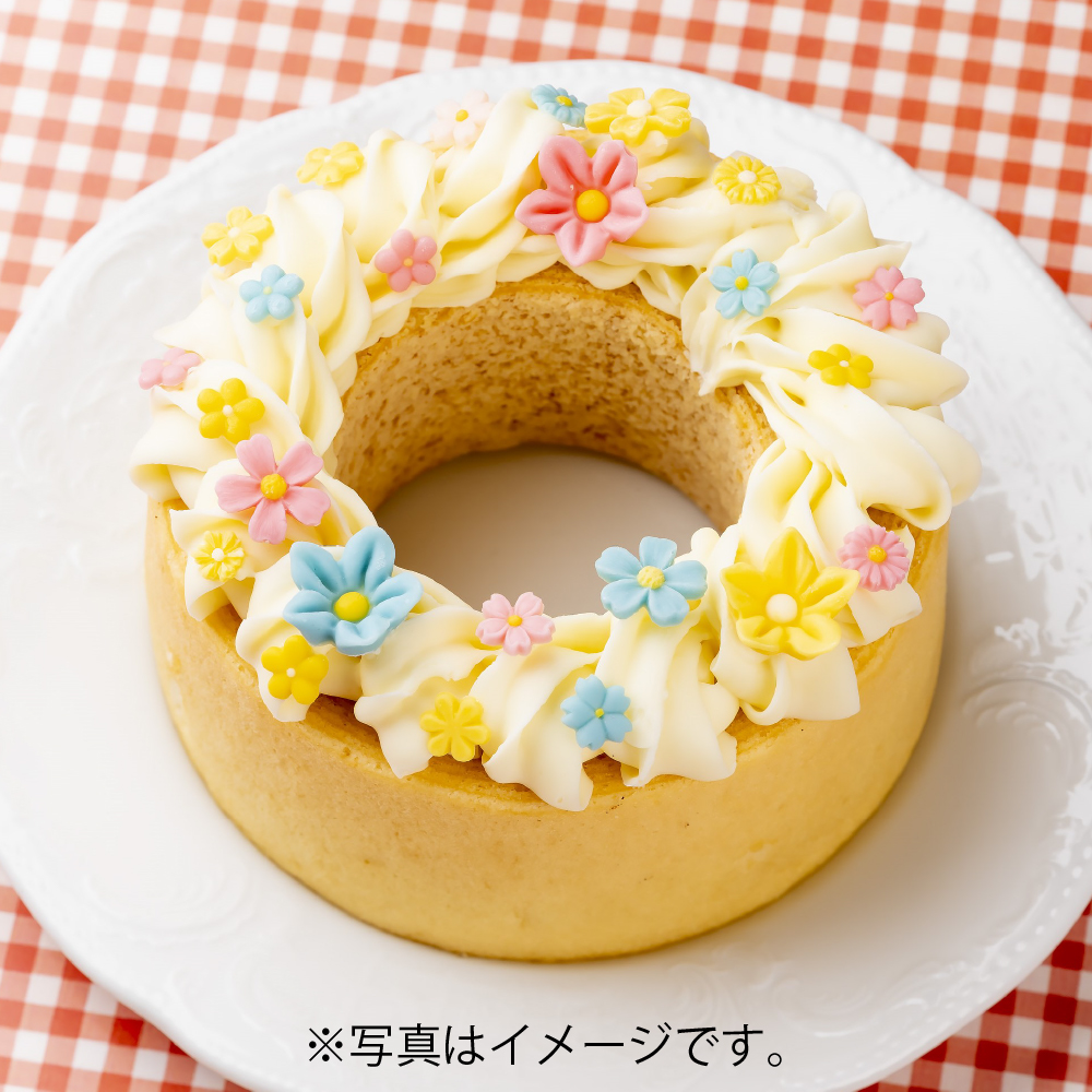 お花のかわいいリースをのせたバウムクーヘン。春夏秋冬それぞれのお好きな季節のお花をあしらったバウムクーヘンで、気分を華やかにアップ。大切な方へのお誕生日にも、いつものバースデーケーキとはちょっと違った趣で素敵なデコバウムを贈ってみませんか?バウムクーヘンの天面に春夏秋冬の季節のお花をあしらったバタークリームの王冠を添えて販売します。