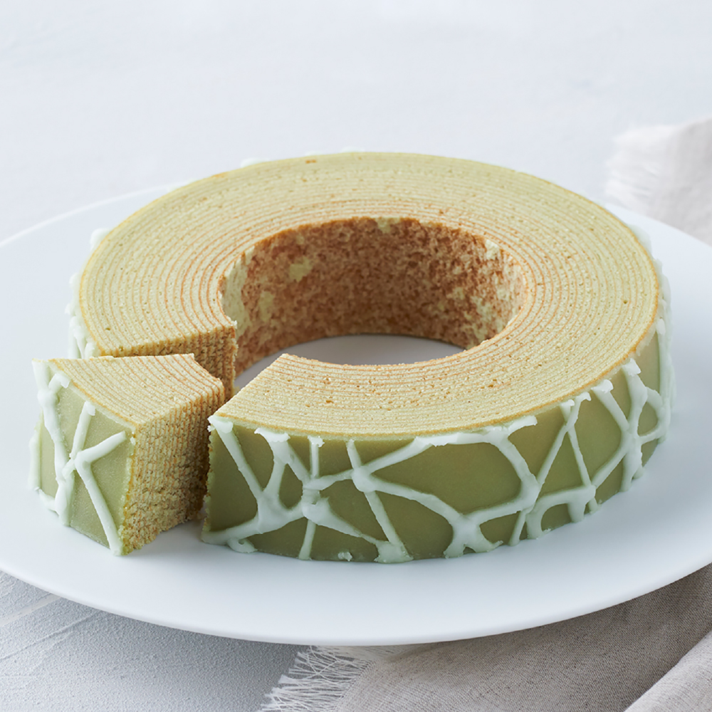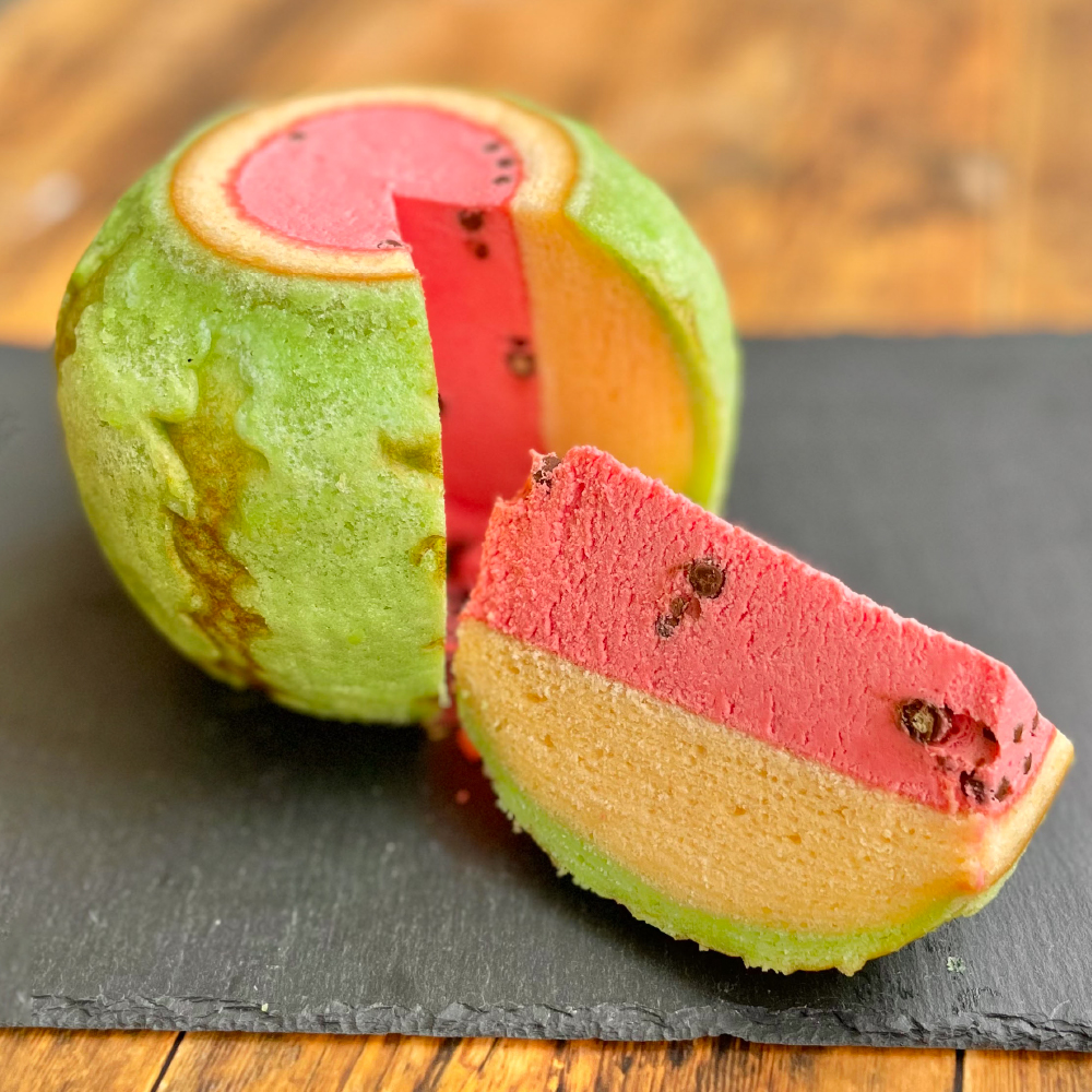 外側はメロン味、中身はスイカ味のムース、種はカリカリ食感のチョコ。見た目だけではない、大人のバウムクーヘン。3日間かけて丁寧に焼き上げました。
