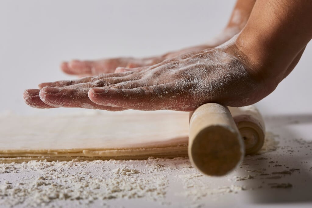 食感を楽しんでいただくため、バターを練り込んだ生地を500層に折り込み、さらに0度に温度管理した状態で一晩寝かせてから焼き上げています。時間を置いてしっとりさせることで、薄い生地ながらもしっかりと食感のあるパイ生地に仕上がっています。北海道産の小麦粉を生地に配合し、パイらしい食感を感じつつも中身のあんこと生クリームを邪魔せず、全体が自然と馴染む味わいになっています。