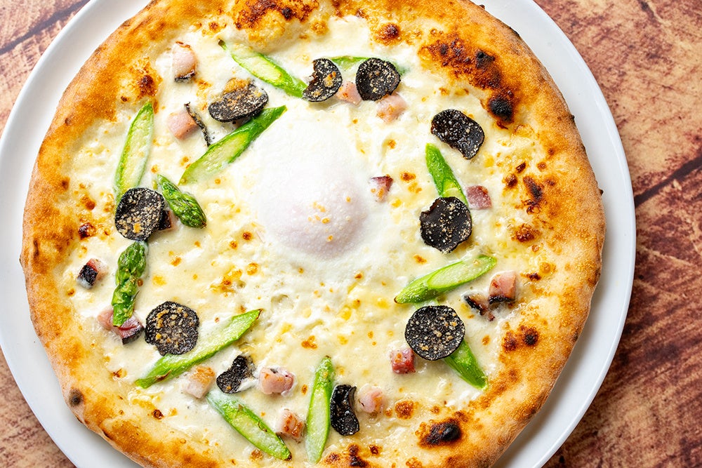 北海道産アスパラと「下川六〇酵素卵」のトリュフビスマルク ピッツァ