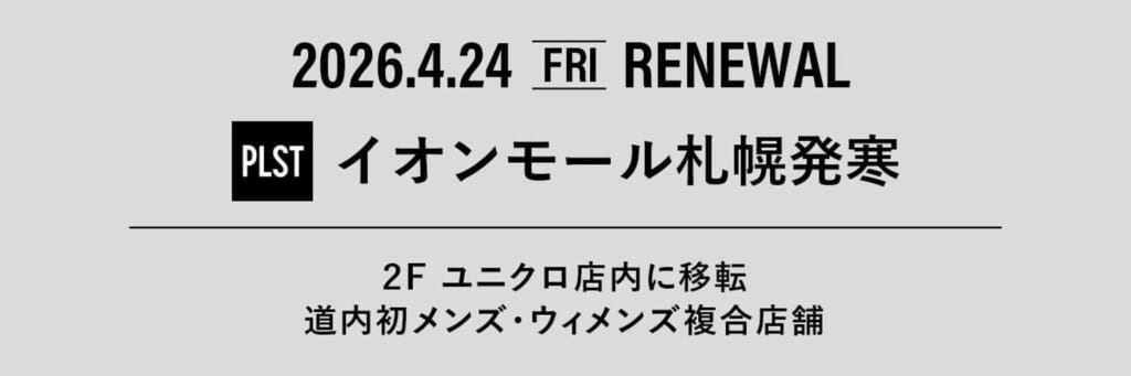 ファーストリテイリンググループの、きちんとしていたい時の“毎日服”を提案するブランド「PLST(プラステ)」は、 「プラステ イオンモール札幌発寒店」を4月24日(金)に増床・移転オープンします。