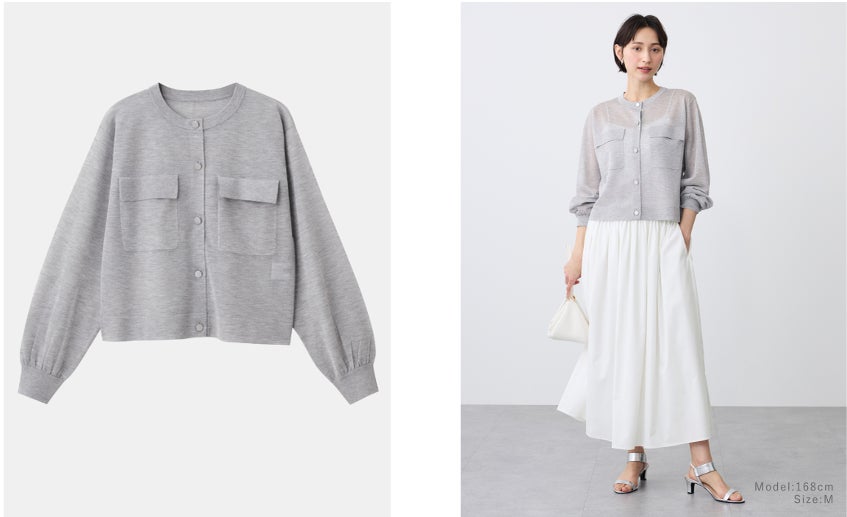 胸ポケット付きのジャケットライクなシアーカーディガン。ハリと光沢感があるシアー素材と、シルバーのメタルボタンがアクセント。